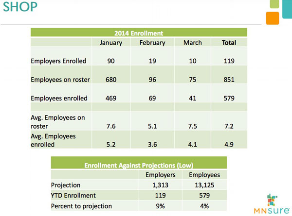 In addition, Minnesota's SHOP (Small Business) exchange tally has gone up a bit to 579 employees covered; multiplying this by a conservative average of 1.8 per employee household brings it up to around 1,042 total individuals covered by MN SHOP plans.