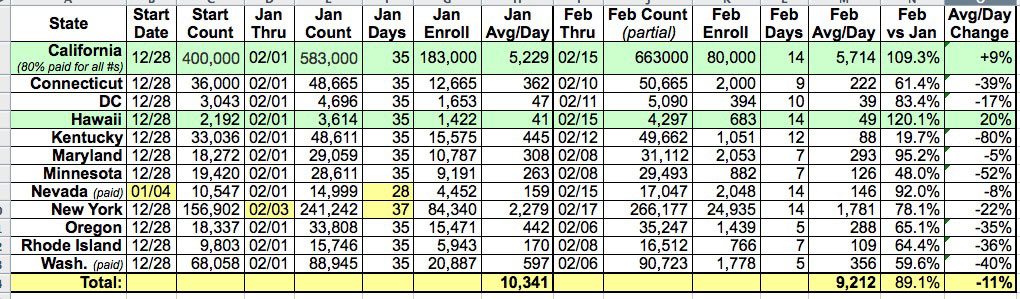 UPDATE: OK, since the California press release also finally includes a "paid/unpaid" breakdown (80%), I've re-run the spreadsheet dropping all of the CA numbers down by 20% to only include paid enrollments. The CA avg. per day stays at a 9% increase over January, but the impact on the overall numbers is lessened a bit, so we're now looking at roughly an 11% drop instead of 9%. This suggests more like 820,000 February enrollments instead of 840,000, but the overall point is pretty much the same: