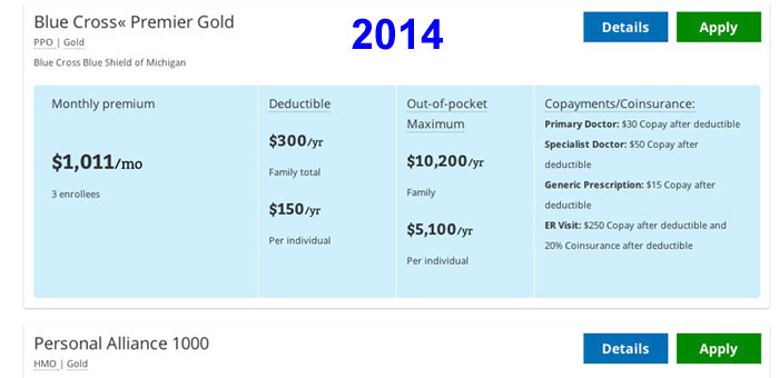 • I've already plugged in my own family's current BCBSM policy to compare it against 2014. In our case, the full price (without any tax credits) has gone up by 7.4%: