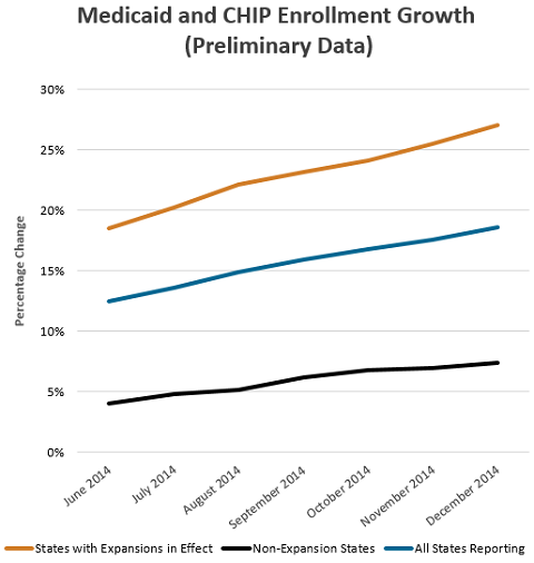 • Among states that had implemented the Medicaid expansion and were covering newly eligible adults in December 2014, Medicaid and CHIP enrollment rose by over 27 percent compared to the July-September 2013 baseline period, while states that have not, to date, expanded Medicaid reported an increase of over 7 percent over the same period.