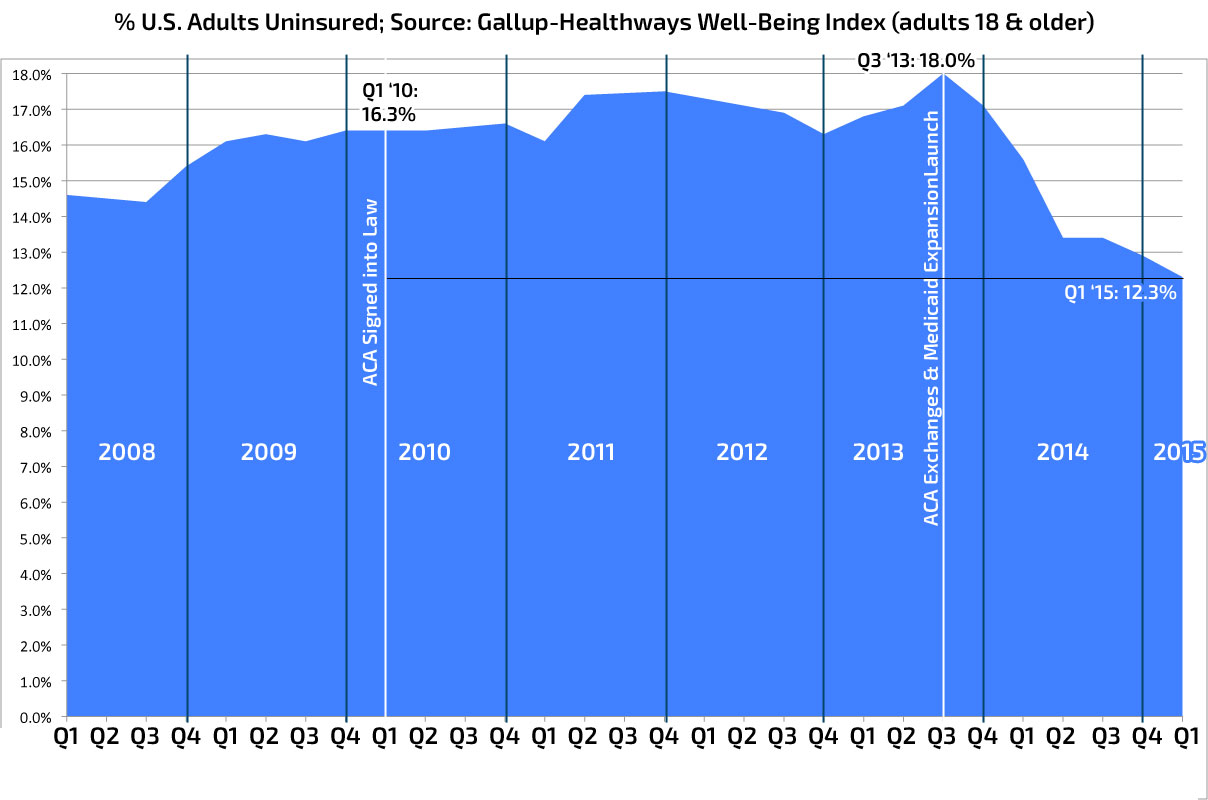 ...The irony here is that they could have touted the "35% reduction in the uninsured rate" just as loudly if they had used October 2013 as the starting point. According to Gallup, in Q3 2013 the adult uninsured rate was 18.0%, and was down to 12.3% as of February 2015. That's a reduction of 31.7%, and doesn't include children under 18 or the 2 million or so exchange enrollees whose policies started on March 1st (as well as a bunch more Medicaid/CHIP enrollees). Throw those into the mix and I'm pretty confident that the overall insured rate is indeed down 35% since just 10/1/13.