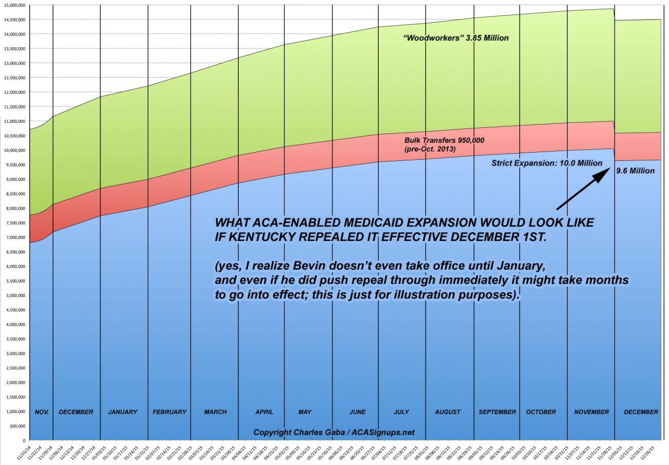 Bevin won't be sworn in until January, of course, and assuming he does make good on his vow to repeal ACA Medicaid expansion, it would presumably have to jump through various legal/legislative/logistical hoops...but just for the sake of illustration, let's assume that he was sworn in tomorrow and managed to have full repeal go into effect as of December 1st, 2015. Here's a visual aid to see what that would look like: