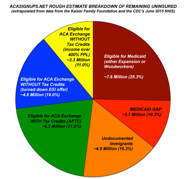 The NHIS results (28.5 million total uninsured) run through June 2015, so they should be more recent and a bit more accurate than KFF's in terms of the total uninsured numbers. However, to be on the cautious side and for illustrative purposes only, let's split the difference at an even 30.0 million.