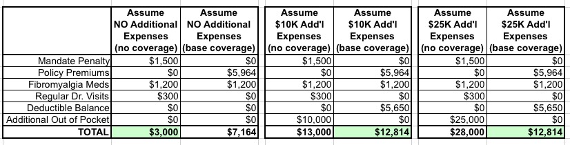 • IF she has no additional healthcare needs, with coverage, her cost will be $5,964, plus her fibromyalgia drugs at full price (long before the deductible is maxed). Her regular checkups would presumably be free as covered preventative care under the ACA. Let's call it $7,200 total for the year.