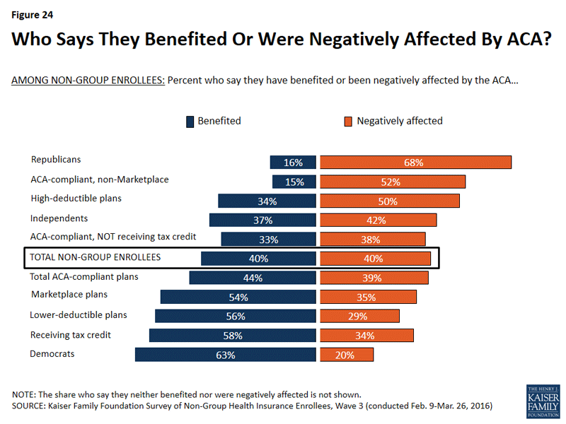 Imagine that: Exactly the same number of individual market enrollees think the ACA has helped them as think it has hurt them...and the split is almost entirely partisan.