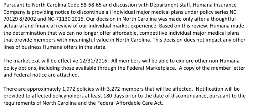 North Carolina's individual market, which only had 5 carriers participating to begin with this year, suffered a double blow recently when both UnitedHealthcare (155,000 enrollees) and Humana (3,272 enrollees) announced that they were dropping out of the market entirely next year (Celtic is also leaving the state, but they have literally just 1 person enrolled state-wide anyway). Fortunately, nature abhors a vacuum, so Cigna Health & Life Insurance decided to join the exchange for 2017. Cigna is already selling off-exchange individual policies, but only has fewer than 1,300 people enrolled in them at the moment. There's also a carrier called "National Foundation Life Insurance" which is raising rates 17.4%...but doesn't have a single person enrolled at the moment anyway, so I'm not sure what to make of that.