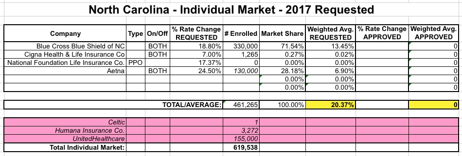 That leaves Blue Cross Blue Shield of NC and Aetna. BCBS's filing is pretty straightforward: 330K enrollees, 18.8% hike requested. Unfortunately, I can't seem to find Aetna's rate filing at all...but according to two separate news articles, they're requesting a 24.5% rate hike, and one of the articles lists their enrollment number as 130,000 people.