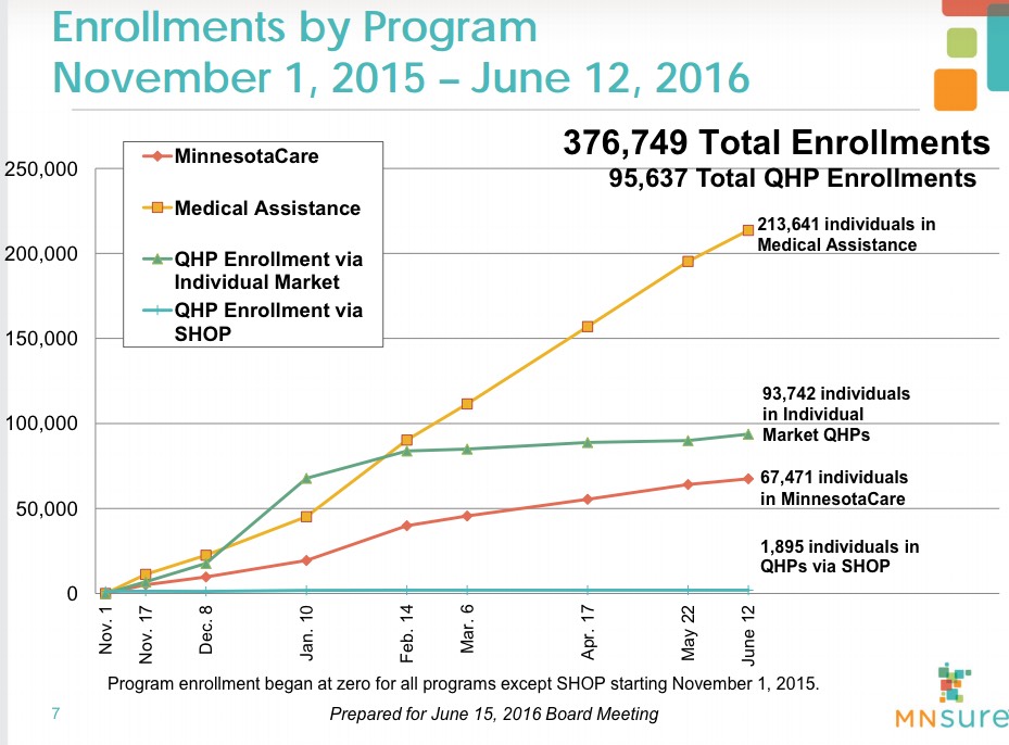 - 5/23/16 - 6/12/16: 95,637 (+3,769, or 179/day); 67,471 MNcare (actually, 112,583 total); 213,641 Medicaid