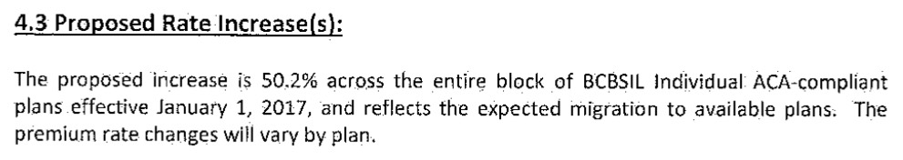 UPDATE: Ouch. As a couple of people called to my attention, while the individual listings for BCBSIL range from 23% to 45%, their actual average requested rate hike is higher yet: 50.2%. As ACA opponent Jonathan Ingram explained, the lower rates appear to include policies which are being cancelled, while the 50.2% figure includes those who are expected to be mapped to plans which will still be available. I've updated the table above to reflect this correction.