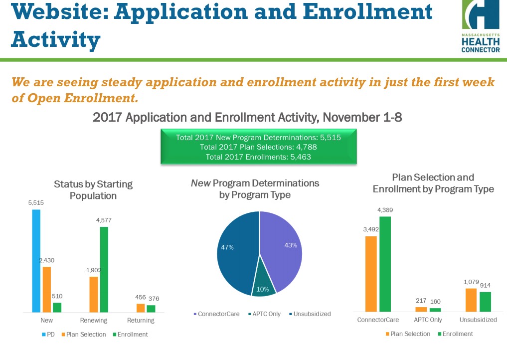 So, assuming every other state is running at a similar pace to MA, around 609,000 people had already enrolled nationally as of 11/08. My official projection was 785K nationally as of 11/07, so this would be a bit lower, but again, it's a very rough, basic estimate which is still in the ballpark.