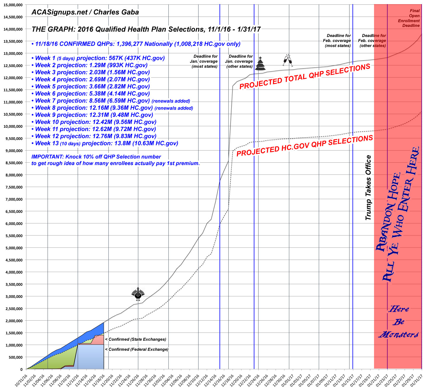 The graph already has a lot going on which can confuse people, so I've decided to remove the "paid" projection line entirely to reduce the clutter. Going forward, just take whatever the "QHPs Selected" number is, lop 10% off of it, and you should have a good idea about "How Many Have Paid!!!"