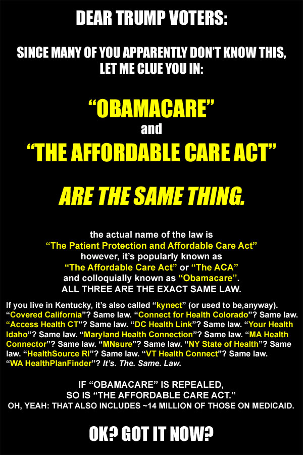 @AlecMacGillis Old white guy in Dr.'s waiting room, sitting next to me:"they said Obamacare would be repealed, not the Affordable Care Act!"