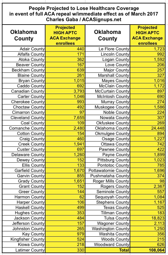 In the case of Oklahoma, assuming 159,000 people enroll in exchange policies by the end of January, I estimate around 108,000 of them would be forced off of their policy upon an immediate-effect full ACA repeal.