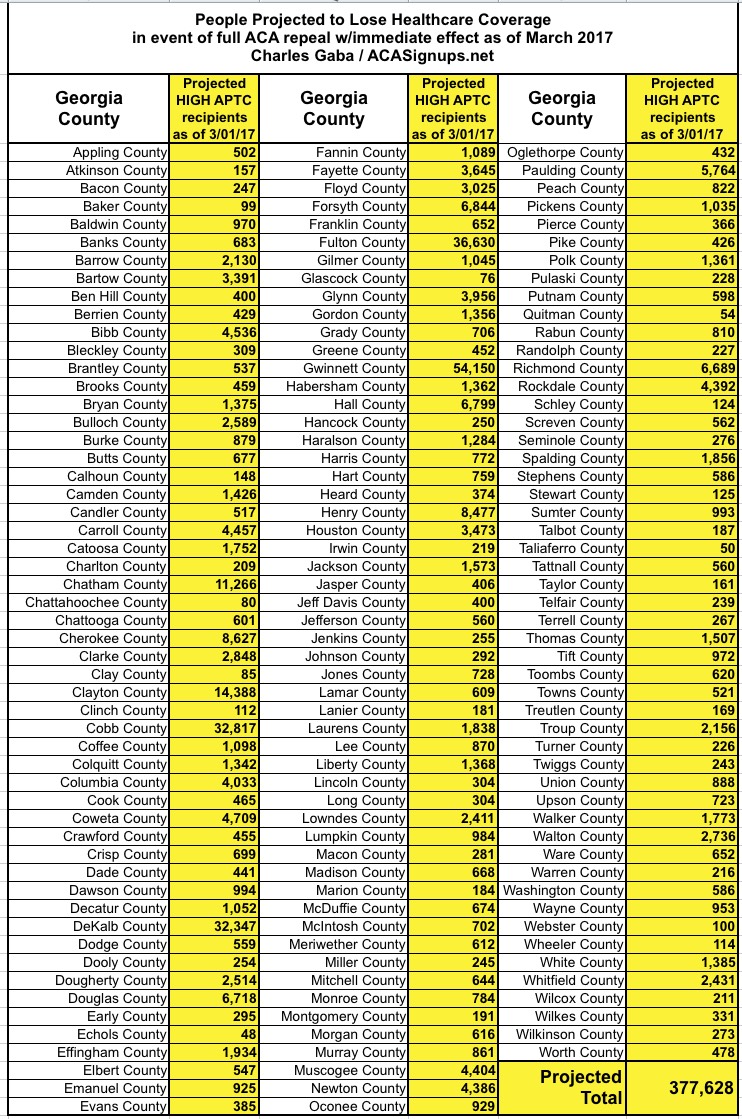 In the case of Georgia, assuming 567,000 people enroll in exchange policies by the end of January, I estimate around 396,000 of them would be forced off of their policy upon an immediate-effect full ACA repeal.