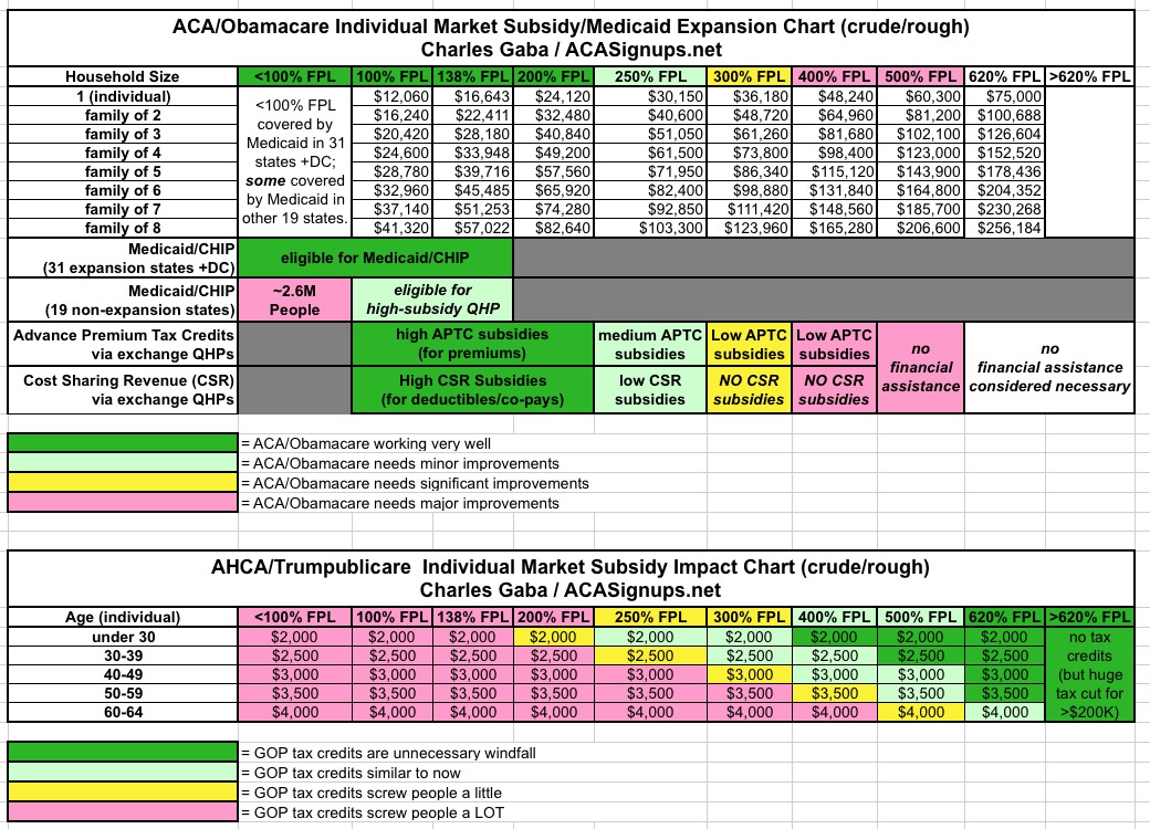 Well, the GOP plan does raise the cut-off line even further, to around 620% FPL ($75,000)...except that the dollar amount is locked in by age, regardless of your income within that range. A 25-year old earning just $20,000/year gets a $2,000 credit...but so does a 25-year old earning $75,000. Meanwhile, a 64-year old earning $20,000 only gets twice as high a credit ($4,000) even though he can be charged up to five times the premium, which doesn't make a damned lick of sense.
