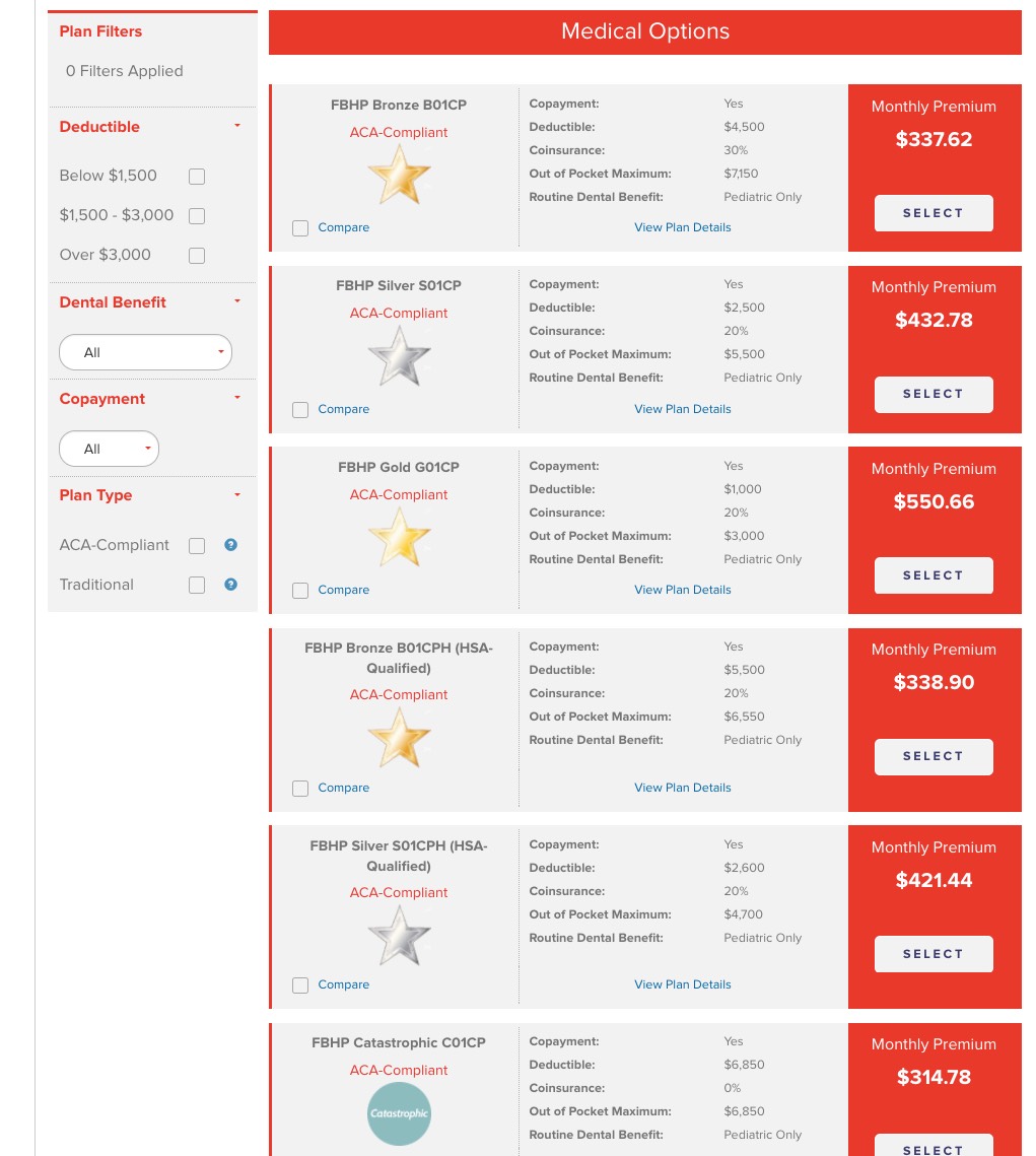 - TRADITIONAL (non-ACA compliant) plans: $100 - $282/mo, $1,500 - $6,000 deductibles; 4 of the 7 include adult & child dental