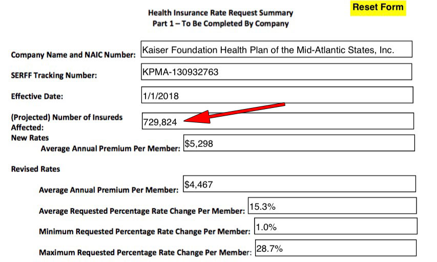 • Second: Most of the filing numbers looked about right, but when I looked at Kaiser Permanente's, it was a whopping 729,000 people, which seemed nuts. I called them up and they clarified that this is the number of member months, not covered lives. In other words, I have to divide that number by 12 to get the actual estimate of how many people they expect to be covered at the end of the year. This is confusing since the field label clearly states "Projected Number of Insureds Affected".
