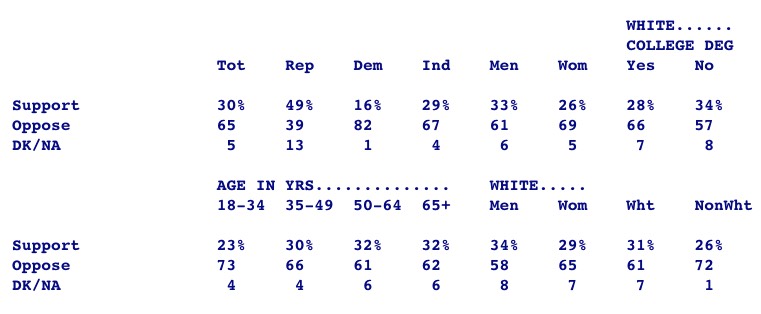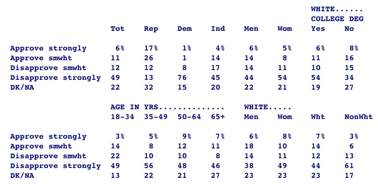 Holy smokes! Both "strong" and "somewhat" approval is exactly the same as in March (6% and 11%), but take a look at the disapproval numbers: All 6 extra points of disapproval have been added to the strong category.