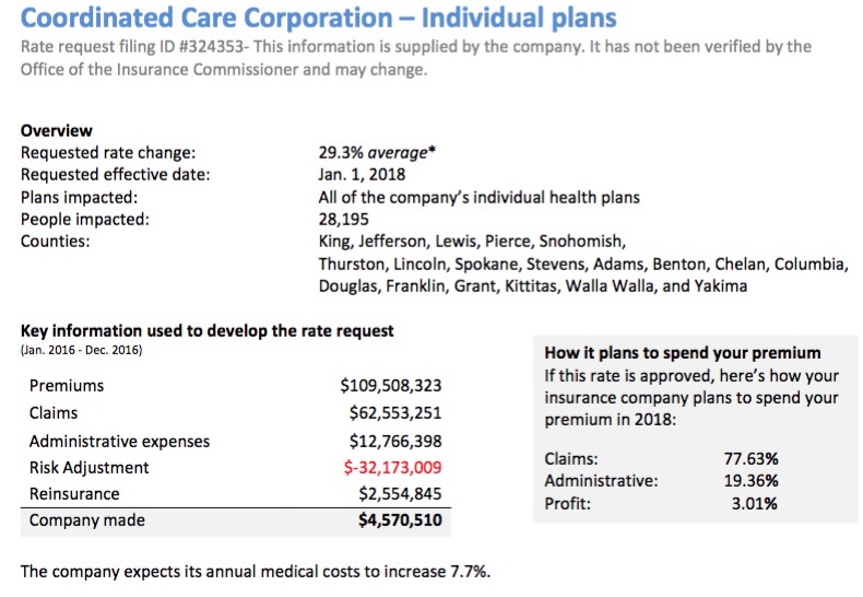 The statewide average is 22.3%...but the WA Insurance Commissioner specifically requested that the carriers break out their actual medical cost increases from the rest of the hike request. You can see this at the bottom left of each rate filing summary; for instance, Asuris Northwest lists their medical cost increase as only being 7.2%. You then have to tack on another 3% to cover the ACA's Carrier Tax (which was given a 2-year "holiday" in 2016 & 2017), which means that without the Trump/GOP Sabotage Effect (Cost Sharing Reduction & Mandate Enforcement uncertainty), Asuris would only be requesting a 10.2% rate hike instead of the 31% they're asking for with CSR/Mandate uncertainty.