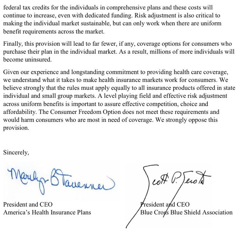 Right on top of the American Academy of Actuaries' open letter explaining the extreme danger of the GOP passing their BCRAP bill (particularly the Godawful Cruz-Lee amendment) comes this joint letter sent to GOP Senate Majority Leader Mitch McConnell (well...and Chuck Schumer, since he is the Senate Minority Leader) from both America's Health Insurance Plans and the Blue Cross Blue Shield Association (h/t to Sahil Kapur and Topher Spiro...not sure who posted it on Twitter first):