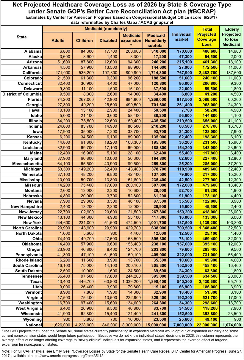UPDATE 7/20/17: The CBO score of BCRAP 2.0 has just been released, and while there are some tweaks/changes to their conclusions here and there, they still project about 22 million people to lose coverage by 2026 if BCRAP 2.0 is signed into law. They still expect about 15 million Medicaid enrollees to lose coverage by 2026. The only significant change on the "net loss of coverage" front is that they estimate that instead of 7 million people losing individual market coverage, they now project a net indy market reduction of 5 million...but also now expect about 2 million people with employer-based coverage to lose that, resulting in a net loss of...22 million.