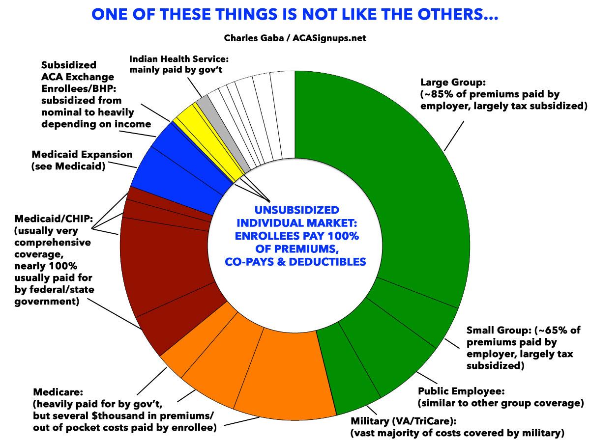 A year and a half ago I compiled a pie chart breaking out the type of healthcare coverage which everyone in the U.S. has (or doesn't have, in the case of the uninsured)...employer coverage, Medicare, Medicaid, the individual market and miscellaneous. Below, I've updated the proportions to reflect slight changes as of Spring 2017...but the main point is that EVERY GROUP OF HEALTHCARE COVERAGE ENROLLEE is heavily subsidized EXCEPT for these 7-8 million people (along with the ~28 million uninsured folks, of course).