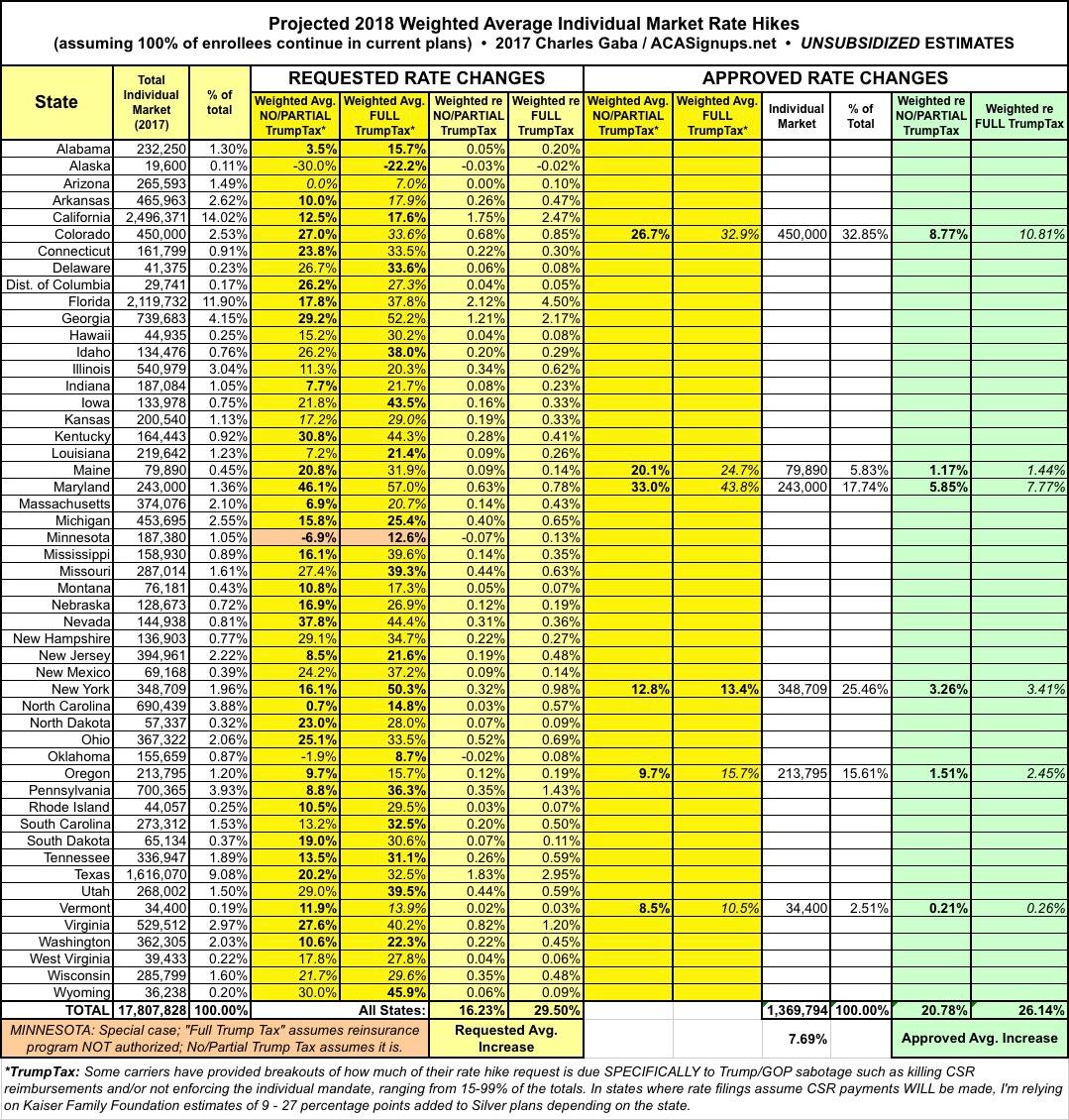 • In August, I had the non-sabotage factors broken into just 2 parts: Medical inflation and the reinstatement of the ACA carrier tax. After reading over more filings and thinking it through, I've decided that it's a bit more complicated than that; many carriers have stated that their "morbidity" in 2017 is still a bit worse than they thought, which basically means that a couple of rate hike points are still simply making up for underpricing in previous years.