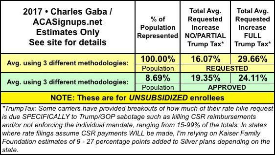 Put another way: If Hillary Clinton was President today, the average rate increases being asked for would be roughly 12% instead of 30%. Don't get me wrong, a 12% increase still wouldn't be anything to brag about given the increases over the past 2 years, but it'd still be a whole lot better than 30%.
