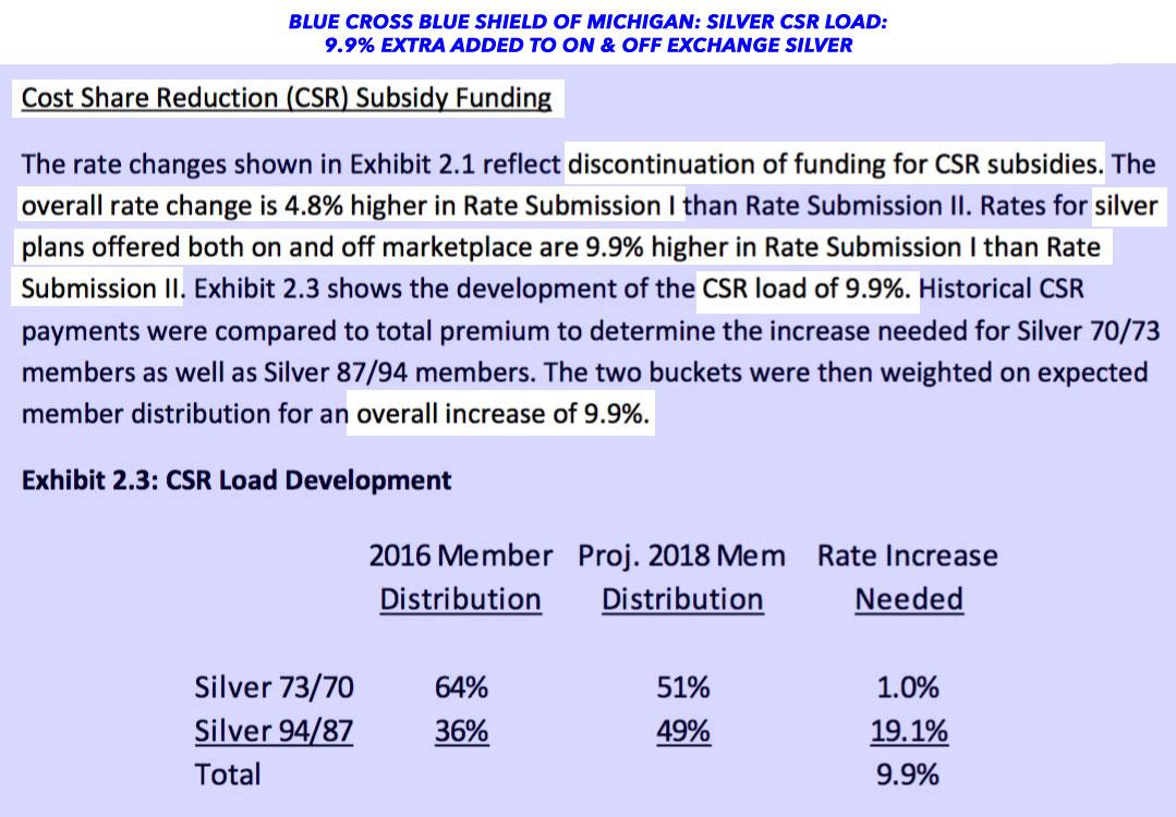 As in most states, the Michigan Dept. of Financial Services, seeing the potential writing on the wall, sent out a memo to all individual market insurance carriers instructing them to submit two different sets of rate filings for 2018: One assuming CSR payments would continue, the other assuming they won't: