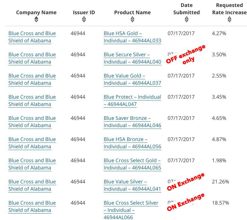 I've also confirmed that Alabama, which we thought was only Silver Loading, is definitley going the full Switcharoo route. There's only one carrier on the individual market in Alabama anyway (no, "Freedom Life" doesn't count), and unlike some carriers, BCBSAL broke out their filings into multiple categories for different metal levels. They have three different Silver filings listed, two available on exchange, on available off exchange only...and it's pretty obvious that they're only loading the CSR cost onto the on-exchange Silver plans, with the off-exchange Silver coming in at the same nominal 3.5% increase which is typical of the other Bronze and Gold plans: