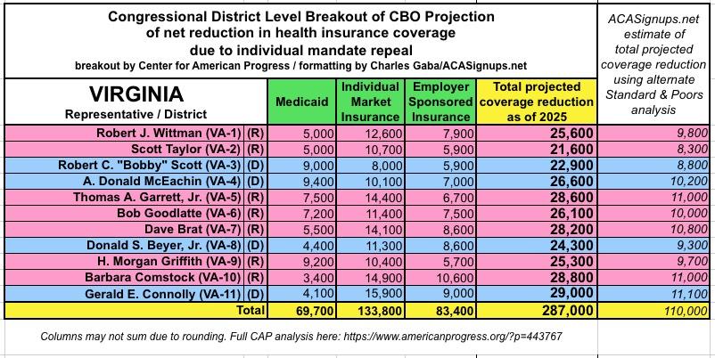 One more thing, however: In addition to the Congressional Budget Office projections, I've also included my own CD-level breakout of the lower coverage loss projections estimated by Standard & Poors. Unlike the CBO's 13 million projection, S&P estimates that only around 5 million people at most would lose coverage over the next several years if the ACA's individual mandate were to be repealed (without other significant changes to the law).