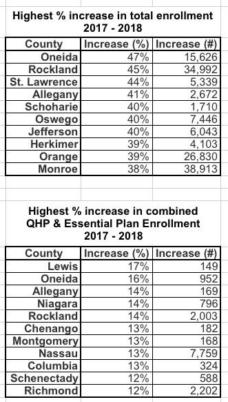 Statewide, enrollment in the Essential Plan and Qualified Health Plans, insurance coverage for New Yorkers not eligible for Medicaid, collectively increased by 9 percent compared with 2017. Enrollment in these programs increased in 58 New York State counties.