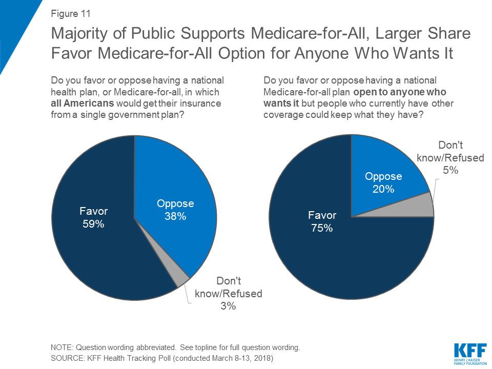 Support for such a proposal increases when framed as an option for anyone who wants it; three-fourths of the public favor a national Medicare-for-all plan open to anyone who wants it, but would allow people who currently have other forms of coverage to keep the coverage they already have.