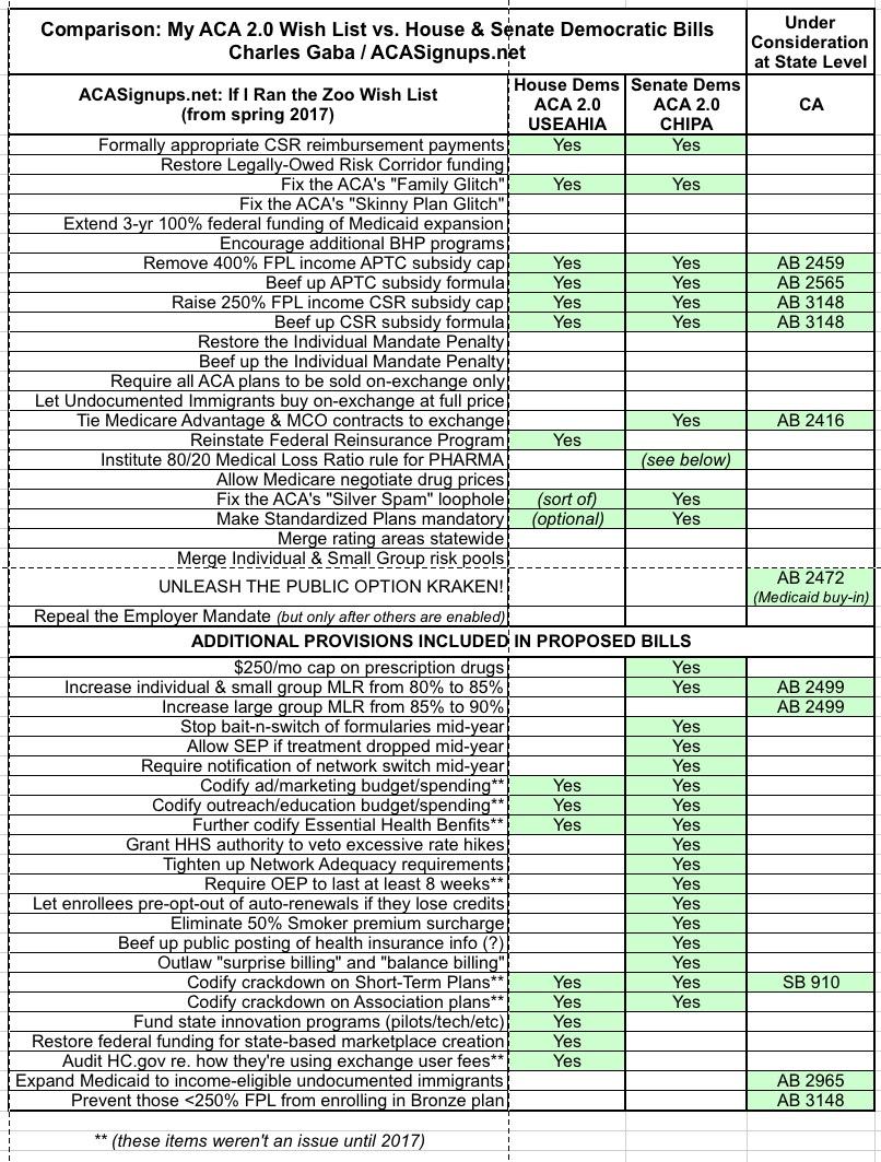 In any event, I've updated my comparison chart to show how California's state-level bills would line up (if they all became law) against my own list, the House Dem bill and the Senate Dem bill. As you can see, there's quite a bit of overlap on several provisions, most notably on the APTC/CSR subsidy front, where all three would beef things up considerably, and on Trump's Short-Term Plan sabotage:
