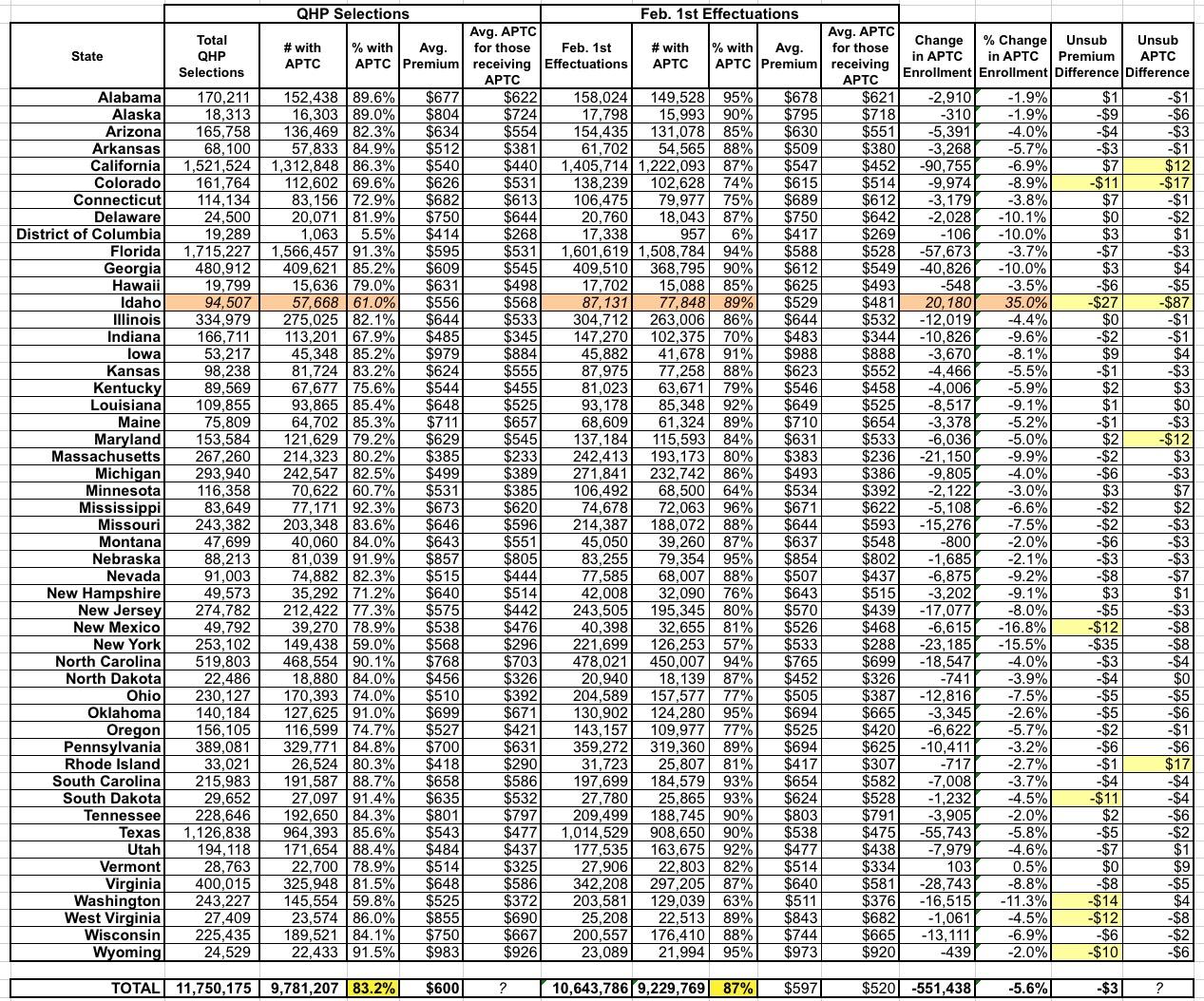 The one which really stands out is, again, Idaho: According to the official CMS OE5 PUF and Effectuation reports, the average full-price premium dropped by $27 as of February, while the average subsidy dropped by a whopping $87. Again, this is likely related to a data error for Idaho.