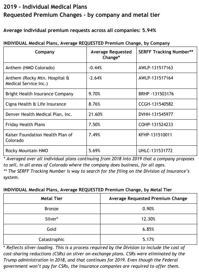 In addition, for the first time in years, an insurance company is requesting a rate decrease for individual market plans for 2019. In fact, both companies under the Anthem umbrella, HMO Colorado and Rocky Mountain Hospital and Medical Service, requested average decreases:  -0.44 percent for HMO Colorado, and -2.64 percent for Rocky Mountain Hospital and Medical Service.