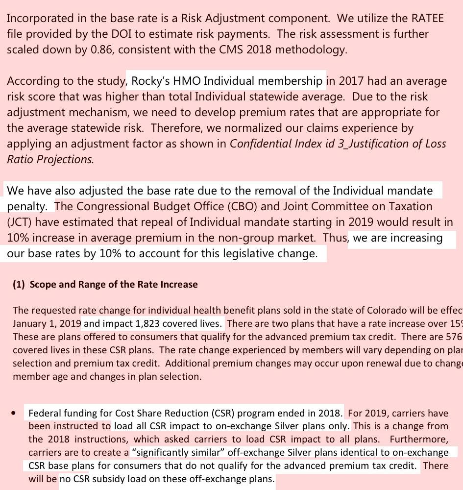 As you can see below, I don't have the hard enrollment numbers for some of the carriers, but the state insurance division has already done the weighted average calculation for me (5.94%). Several of the carriers specified how much they're raising rates due specifically to mandate repeal and/or #ShortAssPlans being expanded (10 points for HMO Colorado/Anthem and Rocky Mountain HMO, just 3.7 points for Friday Health Plans). The others didn't specify the impact, but most do mention it as a significant factor on rate hikes.