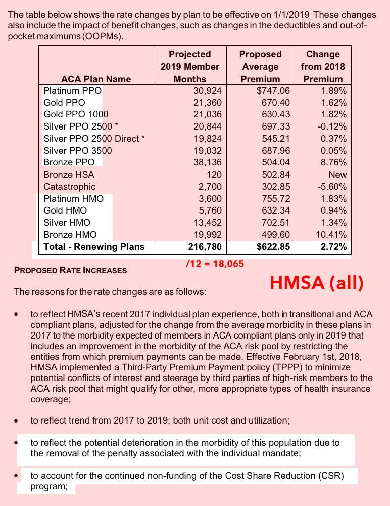 Both filings mention repeal of the Individual Mandate Penalty as a major factor in their rate hikes, but neither gives a specific breakout. The Urban Institute projected a 17.5% impact from mandate repeal and the expansion of short-term plans combined, but Hawaii has taken action to head STPs off at the pass, so I'm knocking 2 points off of that estimate. In addition, as usual, I'm further knocking 1/3 off of Urban's projections in the interest of caution.