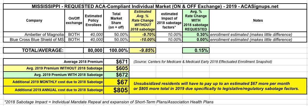 Mississippi: Preliminary 2019 #ACA rate hikes: FLAT, but would likely have DROPPED ~10% without #ACASabotage
