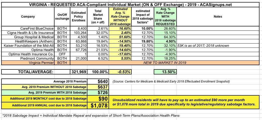 In addition, I should also note that I've updated/revised my own estimate of the average 2019 ACA sabotage impact for unsubsidized enrollees. As you may recall, I originally used the Urban Institute's full impact projections for every state, which in the case of Virginia was 19.1%. Since then, based on numerous actual filing statements from the carriers, I've concluded that Urban overestimated the impact of the mandate being repealed and the expansion of short-term plans somewhat, so I've started knocking 1/3 off of Urban's projections.