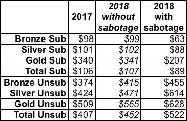 Unsubsidized premiums, however, would have only increased roughly 11% or so across the board (there may have been some variances between the different metal levels). Bronze enrollees would likely have paid around $41 more per month instead of $81 more...a savings of $480 for the year. Gold enrollees would have paid $56 more instead of $119 more...an annual difference of $756. And Silver enrollees would have, on average, paid $47/month more instead of $190/month more...a difference of $143/month or an eyebrow-raising $1,716 for all of 2018.
