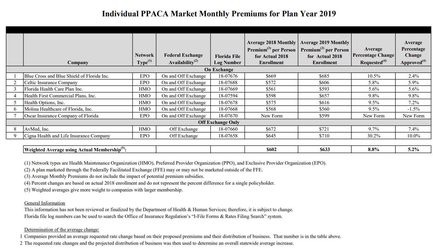 TALLAHASSEE, Fla. – The Florida Office of Insurance Regulation (OIR) announced today that premiums for Florida individual major medical plans in compliance with the federal Patient Protection & Affordable Care Act (PPACA) will increase an average of 5.2 percent beginning January 1, 2019. Per federal guidelines, a total of nine health insurance companies submitted rate filings for OIR’s review in June with final rate determinations due by August 22, 2018.
