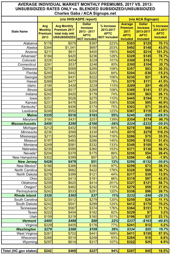 Unfortunately, I still haven't dug up the 2017 average premiums for California, DC or New York yet (although I have more on New York below).