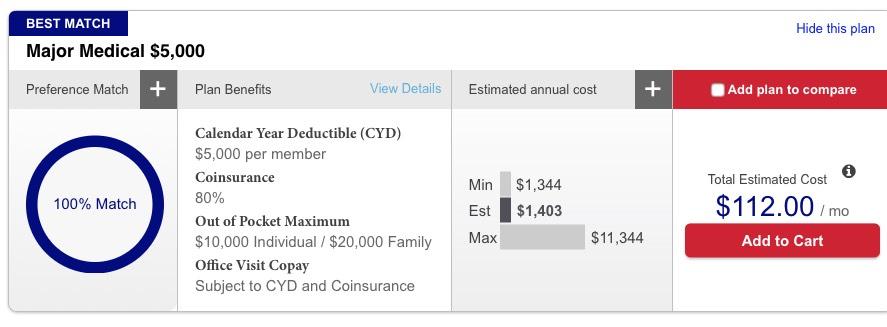 Here's a typical Farm Bureau plan. Remember, this assumes they allow me to enroll at all and don't require a condition exclusion rider or jack up my rates due to my medical condition: