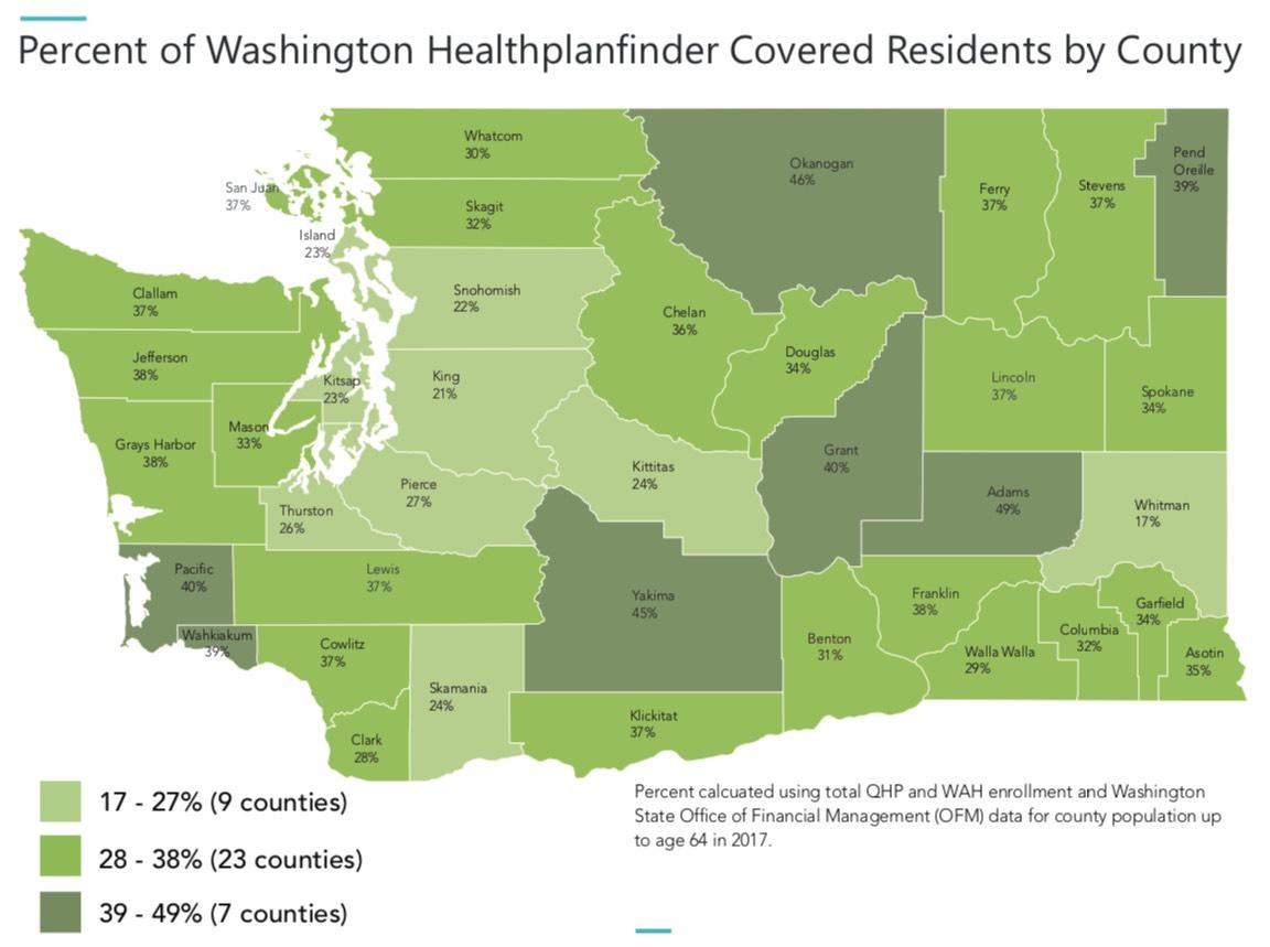 - There are 5 counties that have 40% or more of their population covered by Washington Healthplanfinder (Adams, Okanogan, Yakima, Grant, and Pacific)