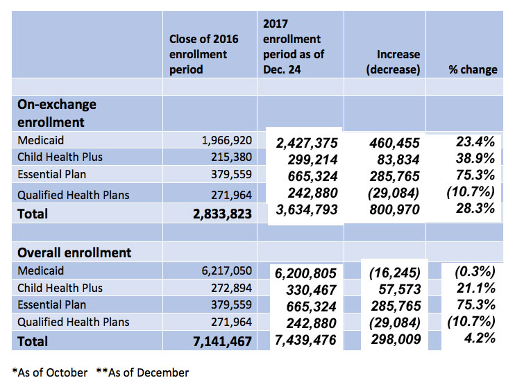 ...The reason for the discrepancy is that DOH’s release counted only sign-ups through the exchange, which handles less than half of the enrollment for the relevant programs. When off-exchange enrollment is included, the picture changes dramatically, as shown in the chart below.
