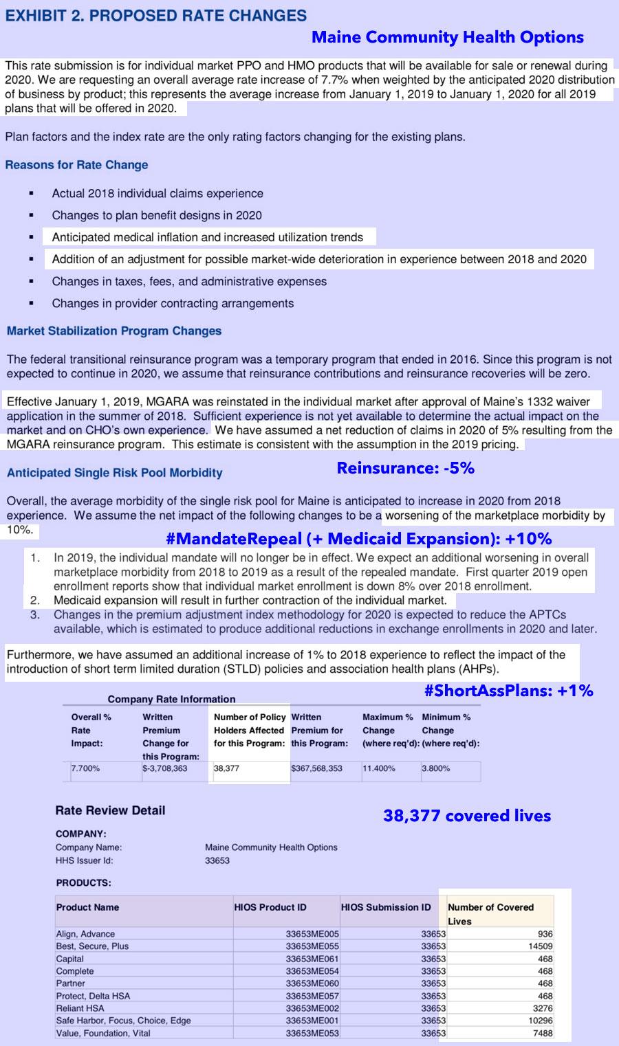 It's important to keep in mind why premiums are going up. I've included screenshots of the rate filing memos--Maine Community Health Options, which holds over 50% of the individual marketshare, clarifies that the combination of the individual mandate being repealed and the expansion of #ShortAssPlans are causing an 11% increase. They also note that Maine's recent Medicaid expansion implementation may be a factor, although normally that reduces premiums since lower-income populations tend to be less healthy than higher-income populations, so I'm not sure what to make of that.