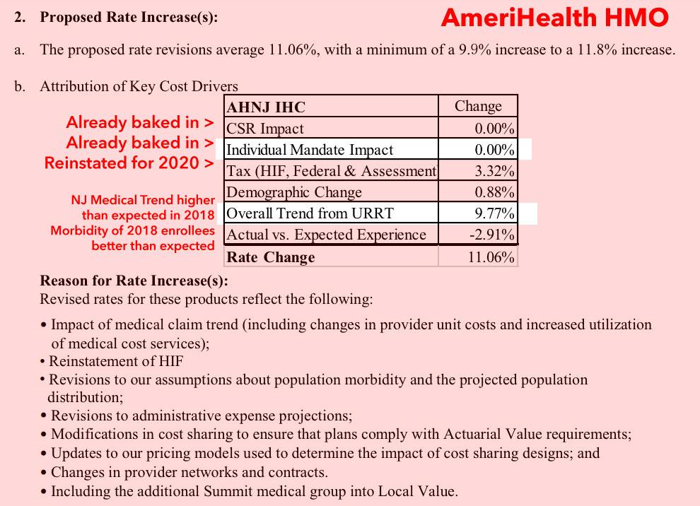 On the surface, this might make it sound like NJ's mandate reinstatement was ineffective (likely in part due to the reasons I noted above). However, the actual rate filings from two of the six carriers on the market (technically a single carrier with two divisions...AmeriHealth HMO and AmeriHealth Insurance Co.) suggest a different reason. I don't know about the other four carriers, but according to AmeriHealth: