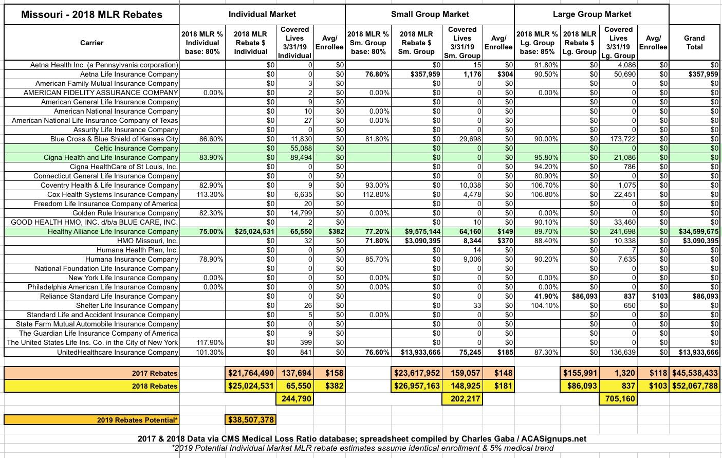 Missouri's total rebate amounts aren't that different from last year...but the average rebate for Individual Market enrollees is more than twice as high: 65,000 enrollees will receive over $25 million in MLR rebates, averaging $382 apiece from Healthy Alliance.