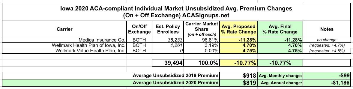 Iowa: *Final* avg. 2020 #ACA premiums: 10.8% decrease